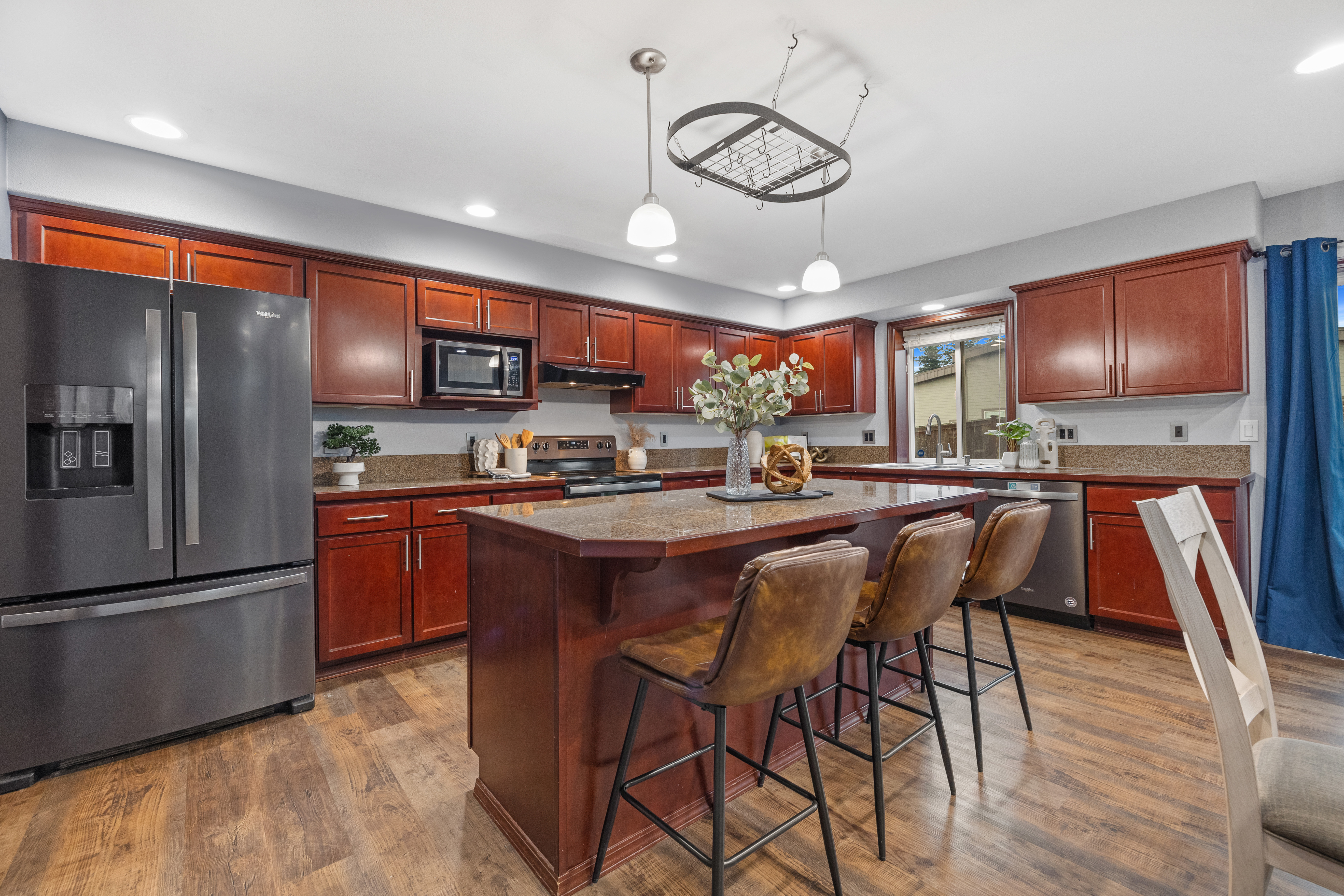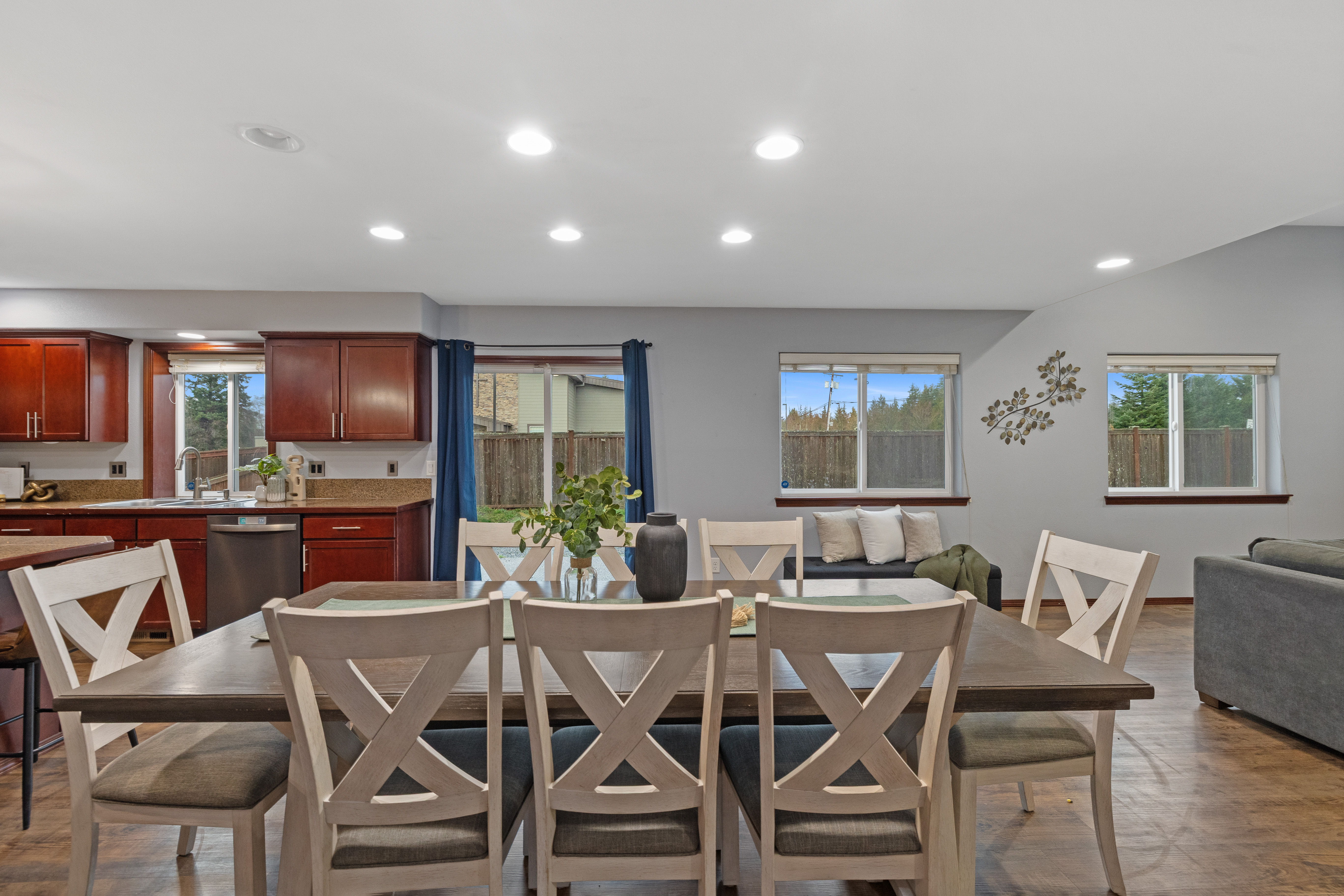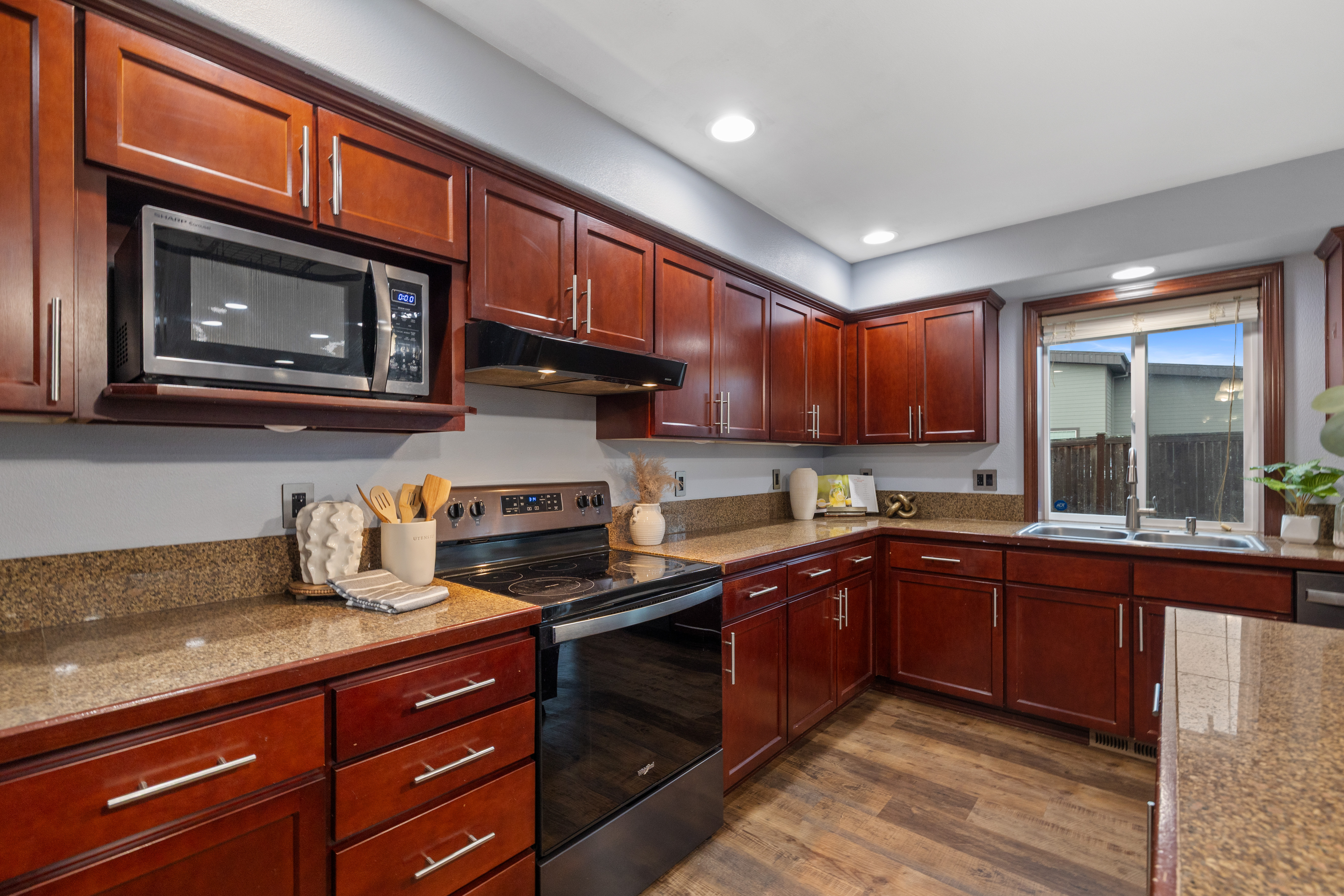Enjoy spacious comfort and modern elegance in this beautifully maintained two-story home on a desirable corner lot. The inviting living room features warm wood-toned flooring and custom built-ins—perfect for cozy evenings or stylish entertaining. The gourmet kitchen shines with granite countertops, stainless steel appliances, and a central island ideal for casual meals. An oversized dining area provides generous space for gatherings of any size. Retreat to the serene primary suite with vaulted ceilings, or indulge in the spa-inspired bath complete with a soaking tub and glass-enclosed shower. Outside, the fully fenced yard offers privacy, play space, and room to entertain. Plus, explore the potential for a DADU to expand your possibilities.